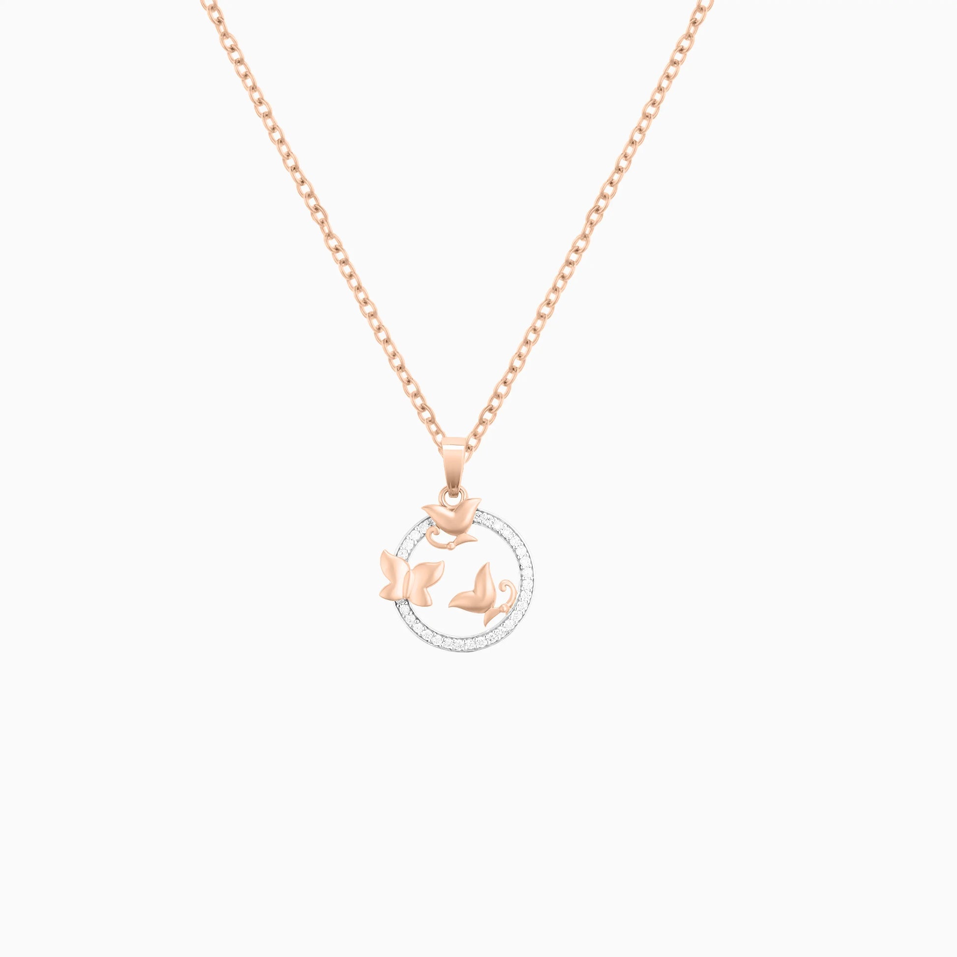 The Butterfly Charm Diamond Pendant features graceful butterfly motifs set within a delicate circular design, adorned with sparkling diamonds. Crafted in rose gold, this pendant embodies elegance and nature's beauty, making it a perfect accessory for any occasion or outfit.