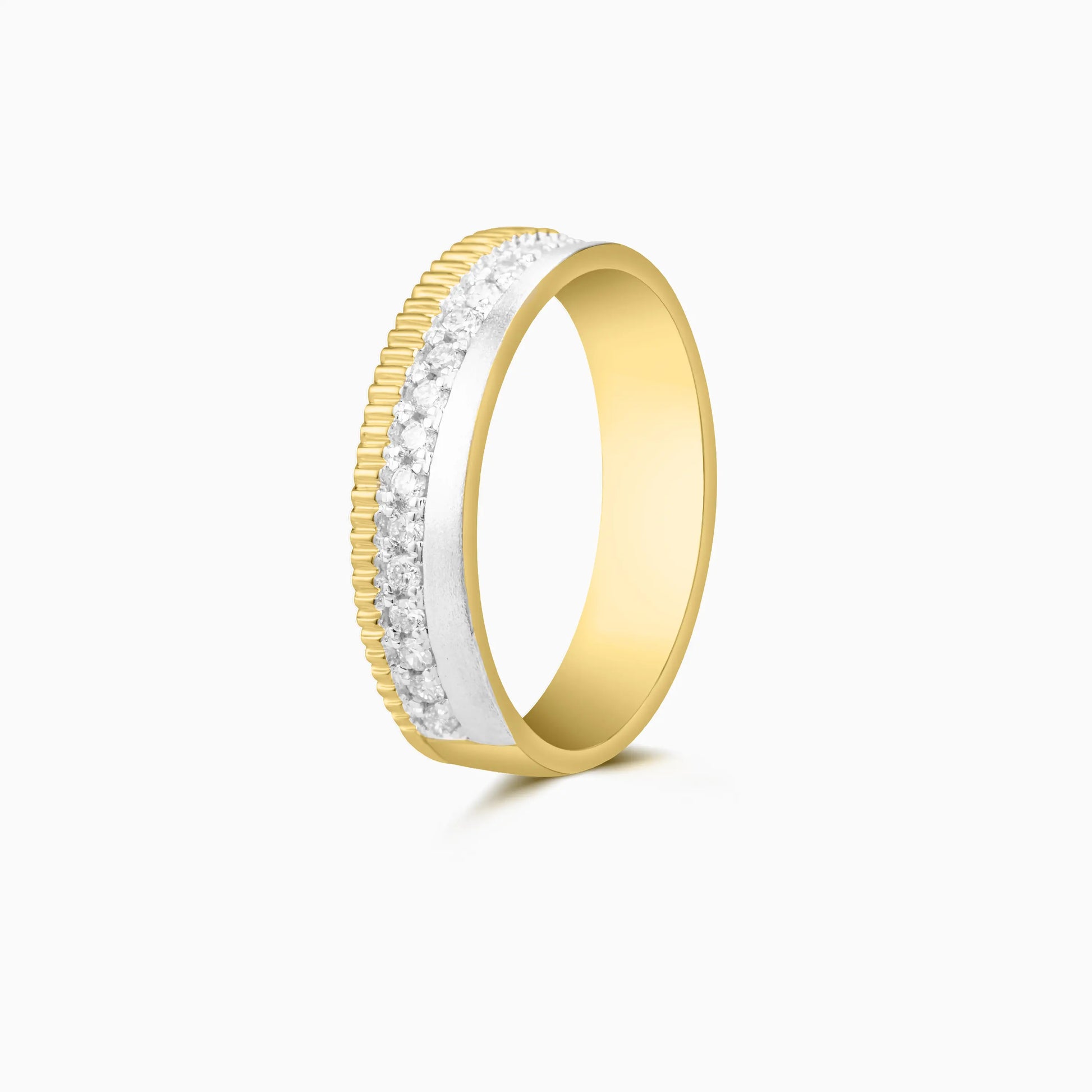 This Classic Diamond Wedding Band features a timeless design with a blend of gold and rhodium plating, elegantly adorned with sparkling diamonds. Crafted for lasting beauty, it offers a perfect balance of luxury and sophistication, making it an ideal choice for weddings or special occasions.