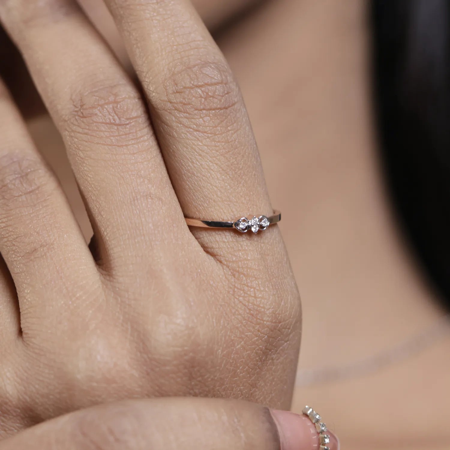 The Delicate Rose Gold Flower Band features a charming trio of diamond-embellished floral designs set on a slim rose gold band. Its intricate yet subtle detailing adds a touch of elegance, making it perfect for those seeking a refined and feminine accessory for any occasion.