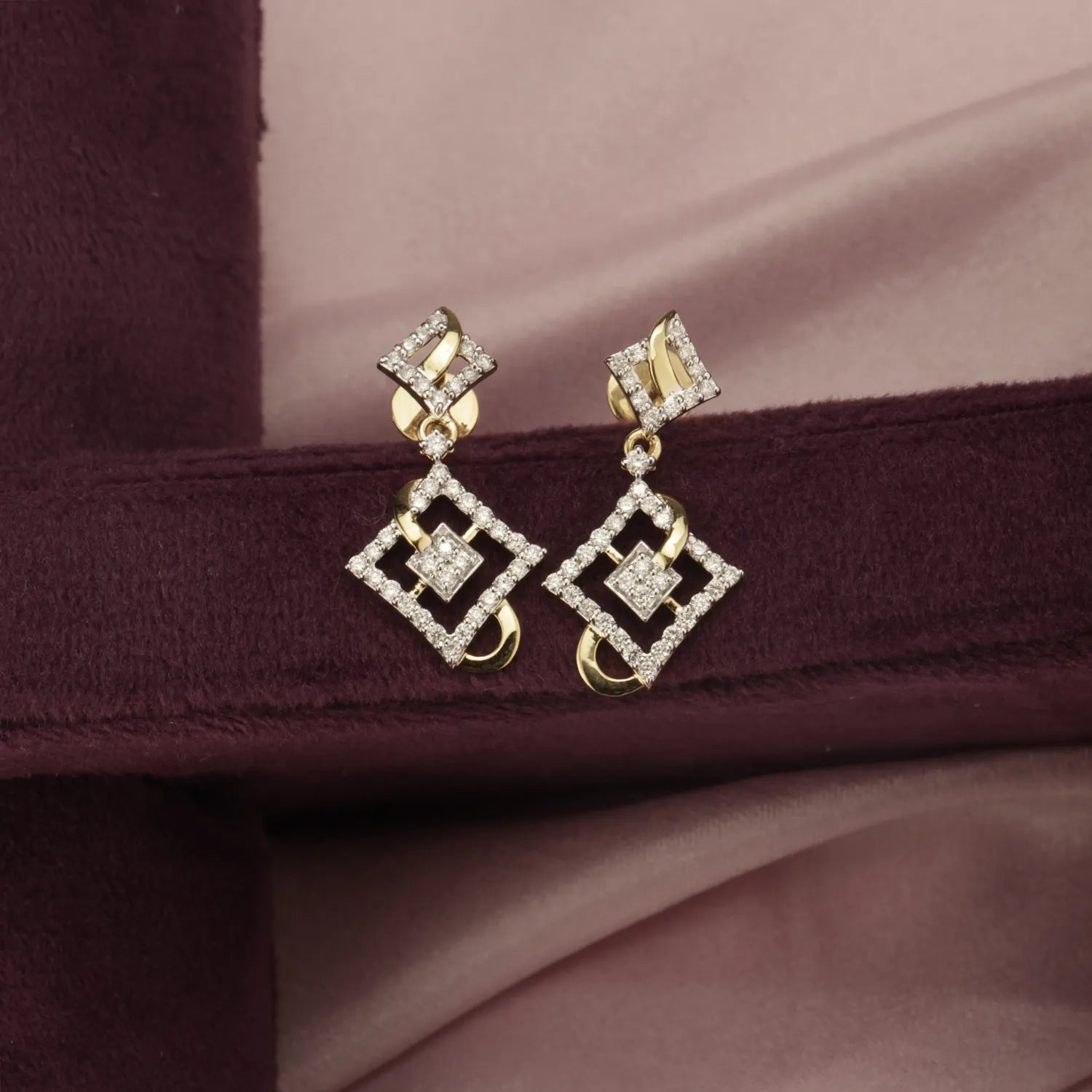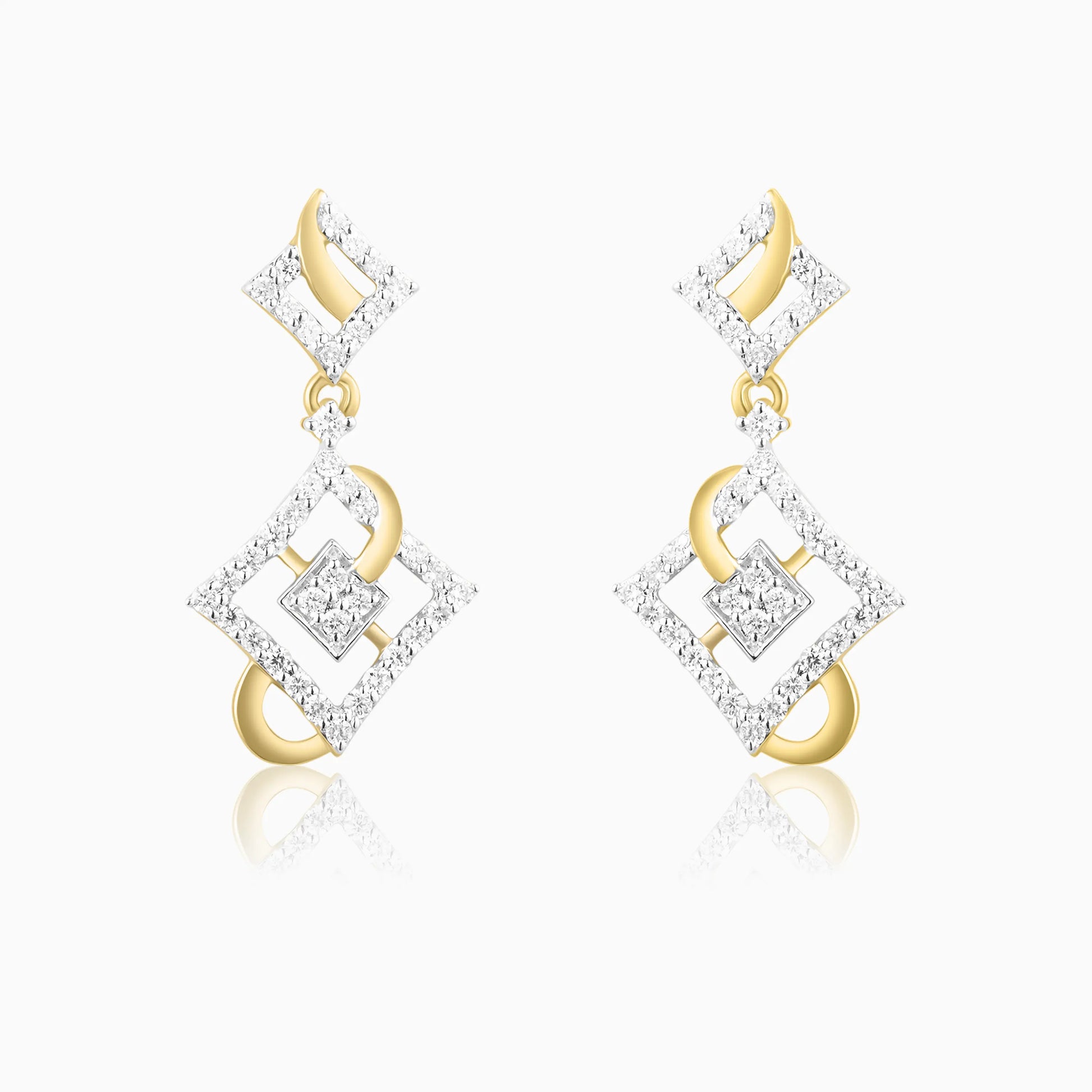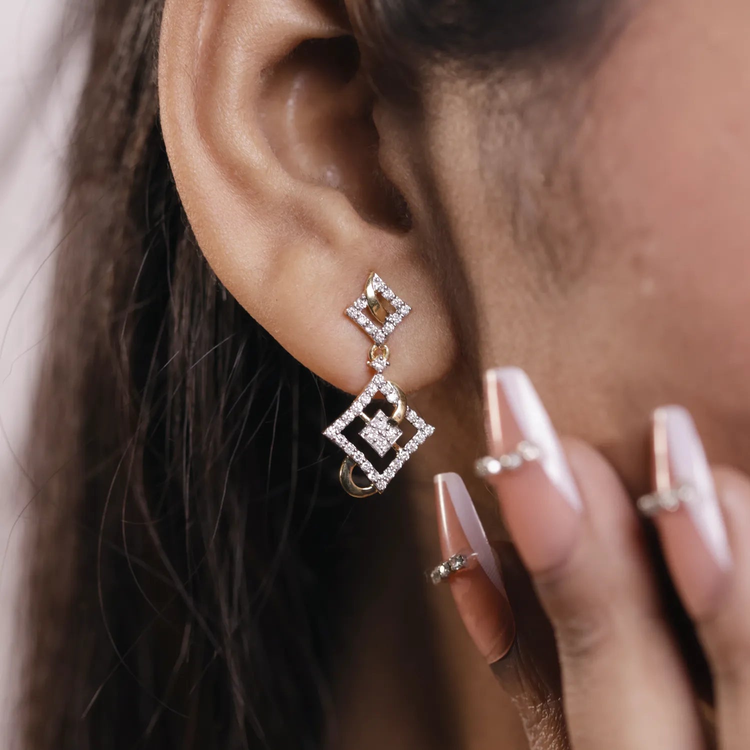 The Double Square Diamond Drop Earrings feature two elegant, interlocking square frames adorned with sparkling diamonds. Crafted in polished gold, these geometric drop earrings offer a modern and sophisticated design, perfect for adding a touch of luxury to any outfit.