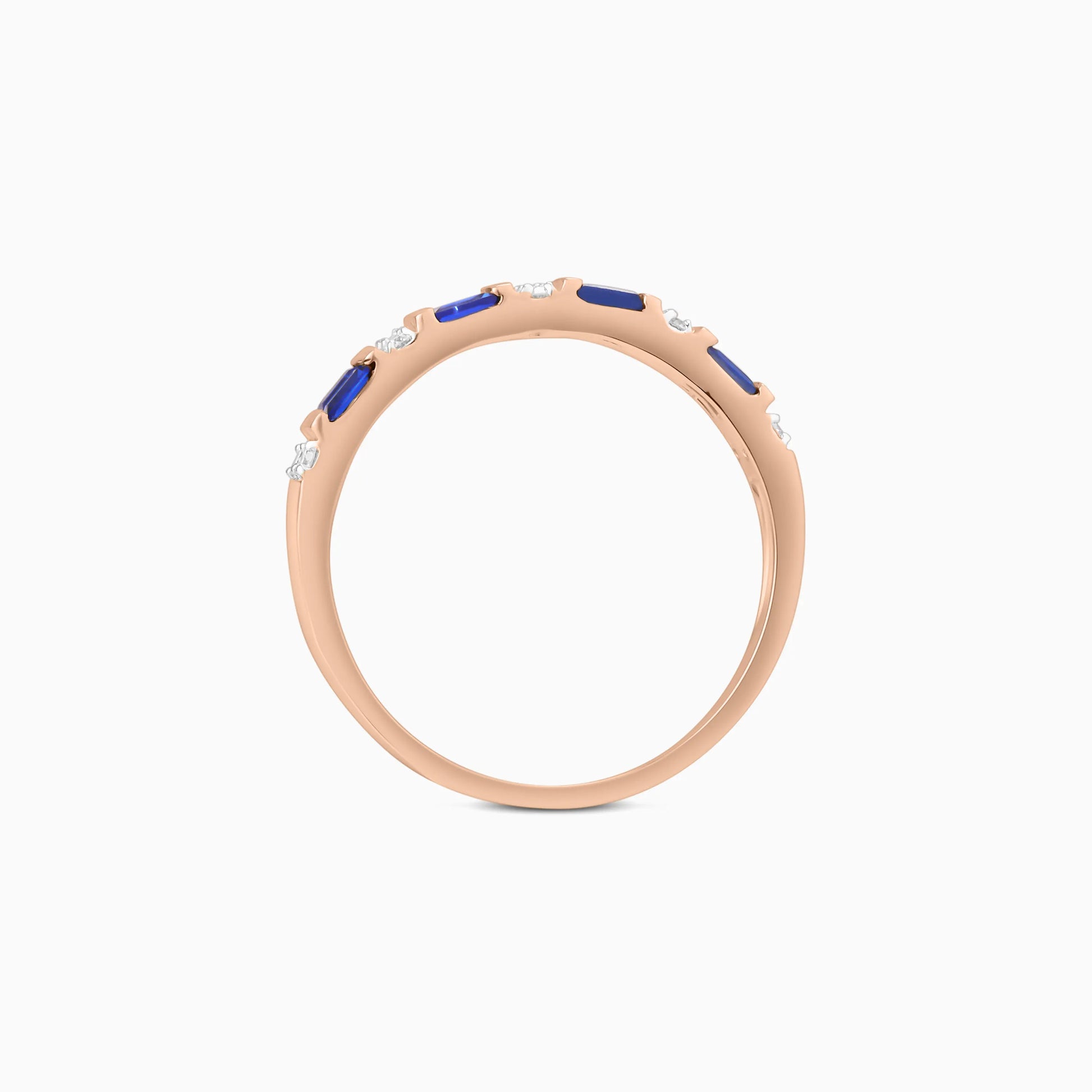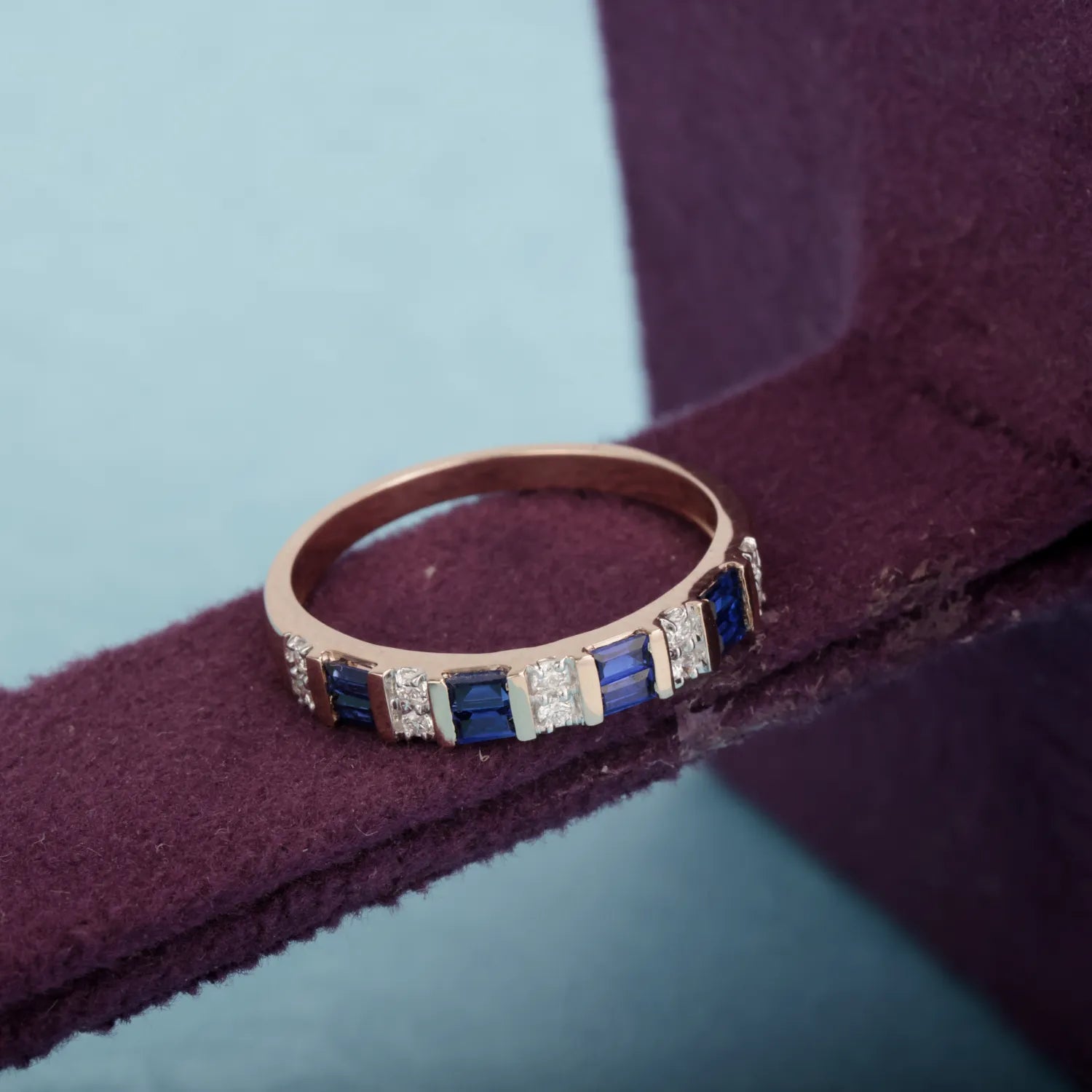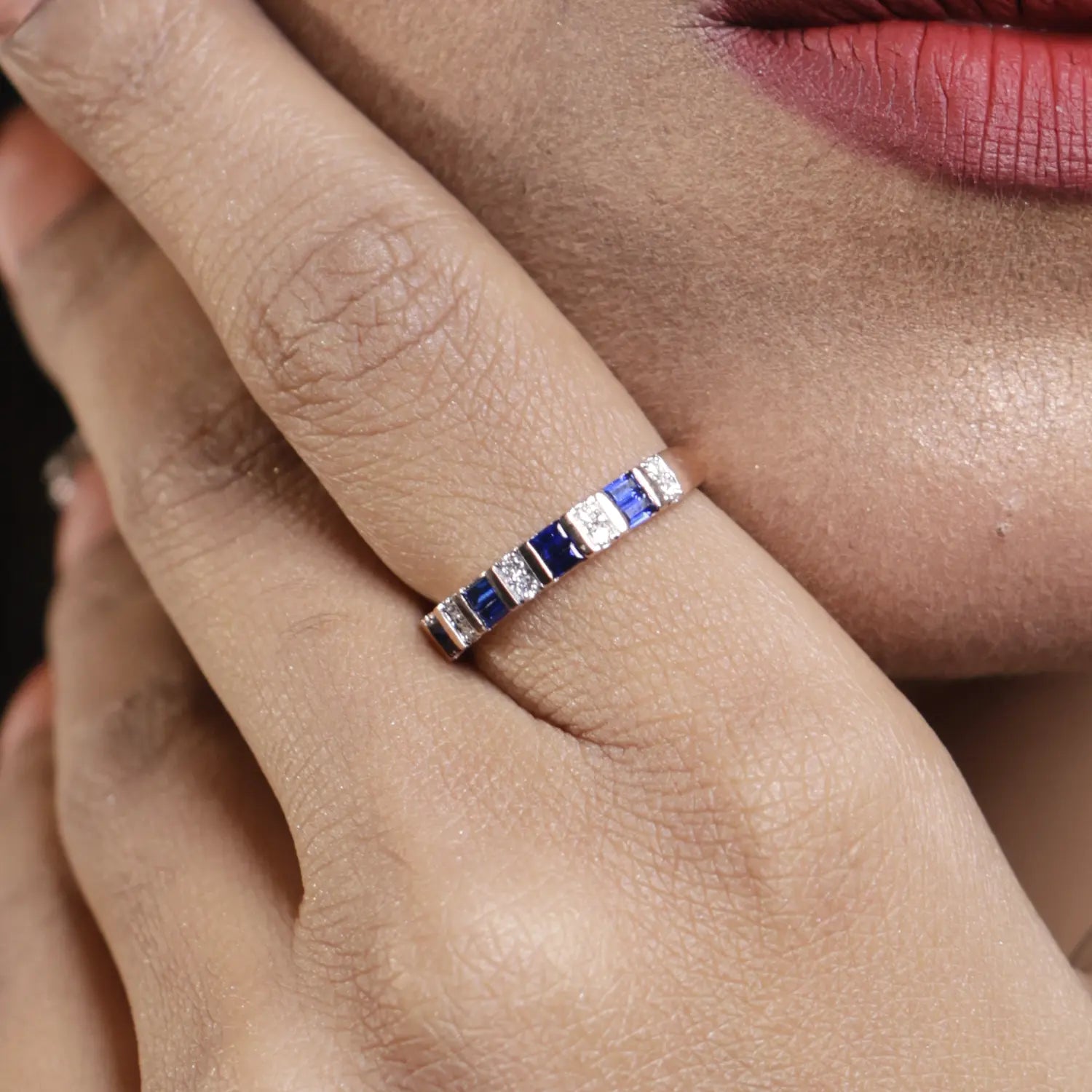 The Dual Row Sapphire and Diamond Ring showcases a stunning combination of rich blue sapphires and sparkling diamonds set in a sleek gold band. The alternating rows of gemstones create a striking, elegant look, making this ring perfect for adding a touch of sophistication to any occasion.