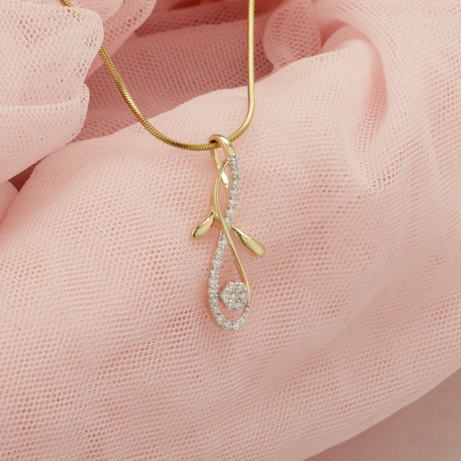 The Flowing Vine Diamond Pendant features a graceful, vine-like design with sparkling diamonds that twist elegantly along a delicate gold curve. Its organic shape and shimmering accents create a timeless and sophisticated look, perfect for adding a touch of elegance to any outfit.
